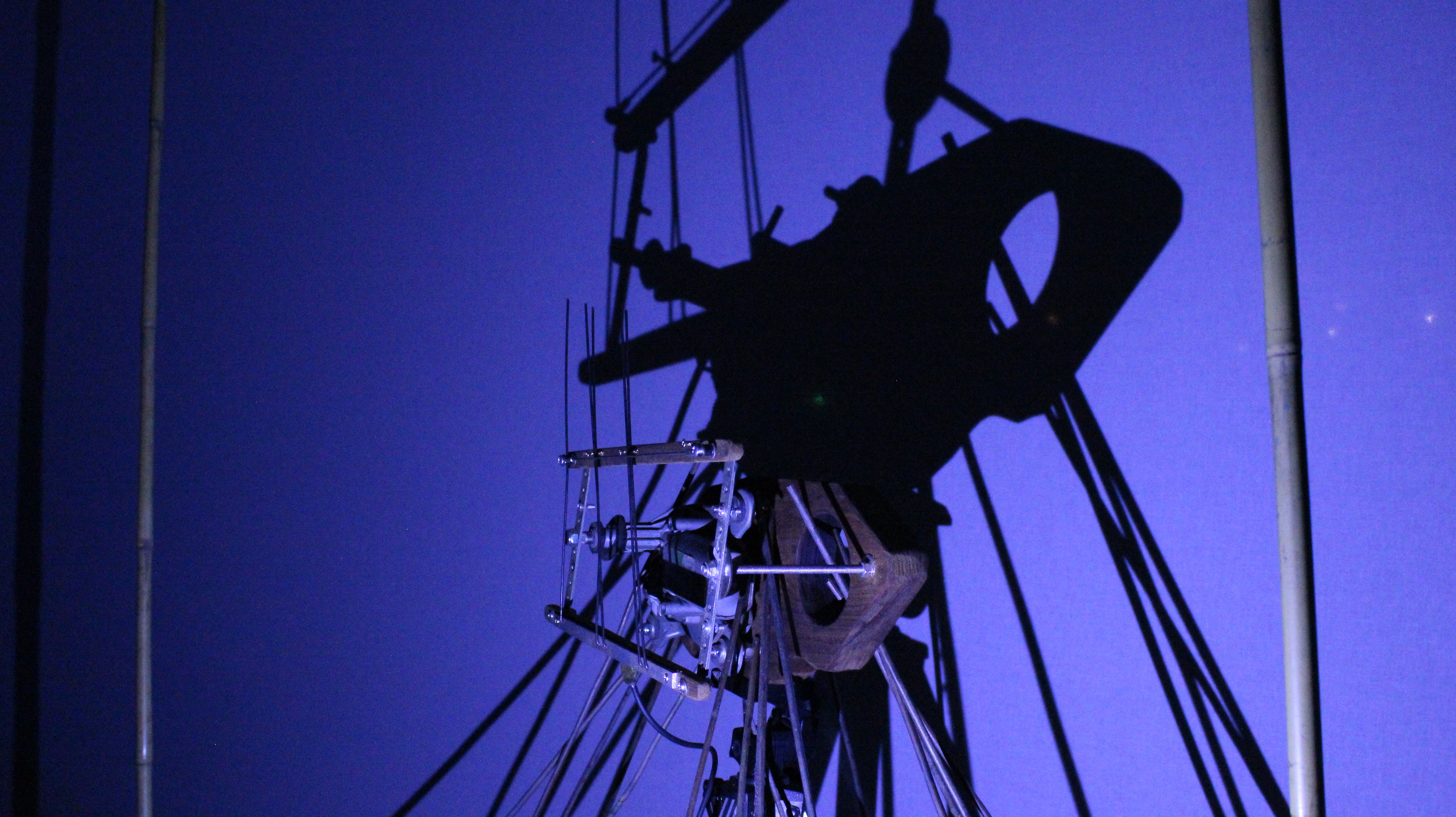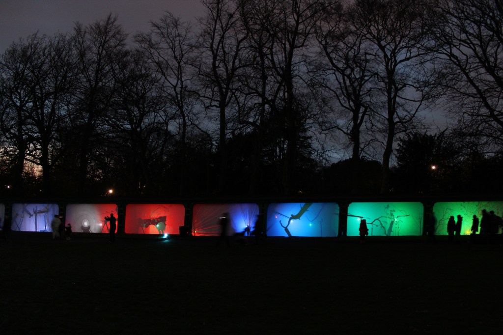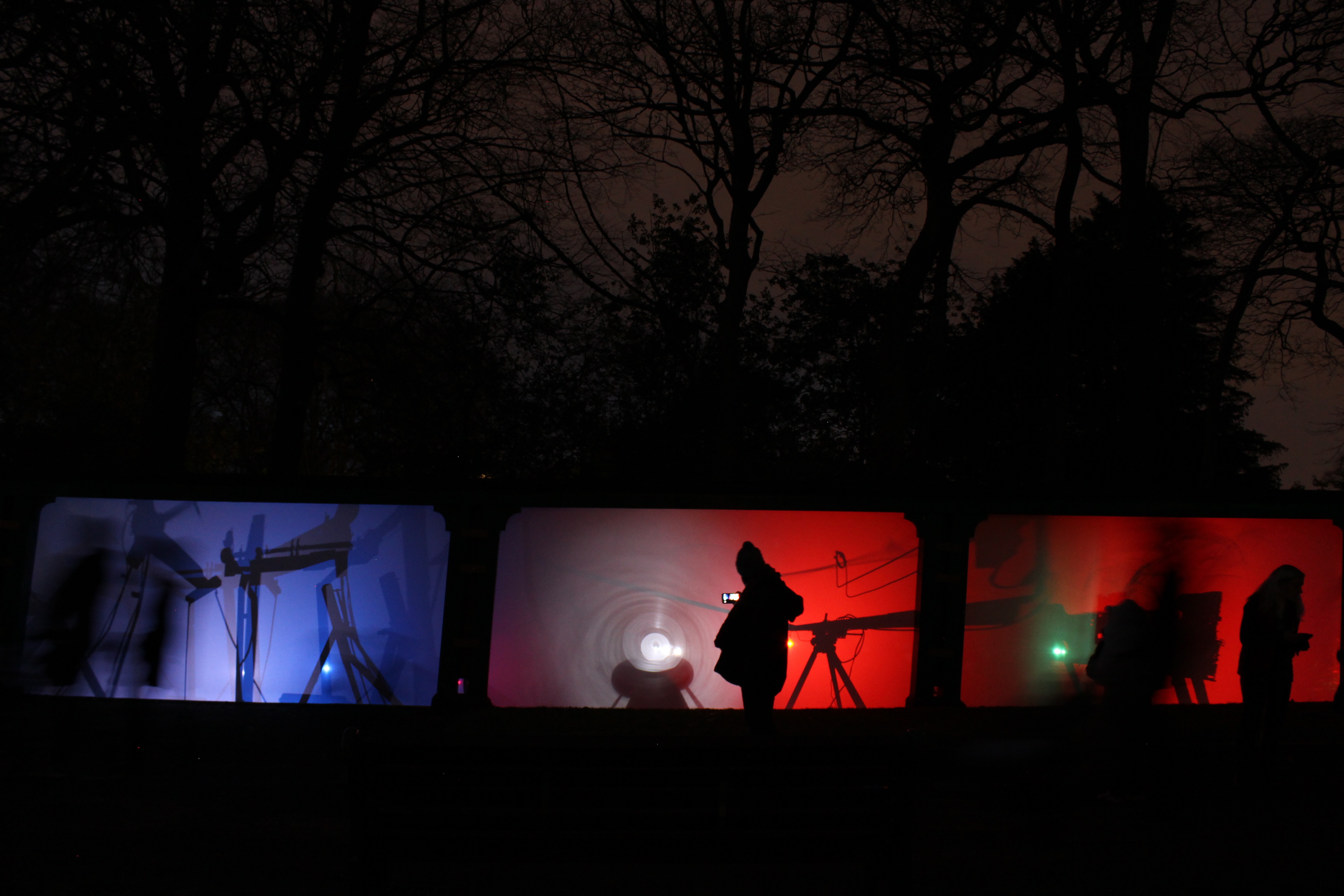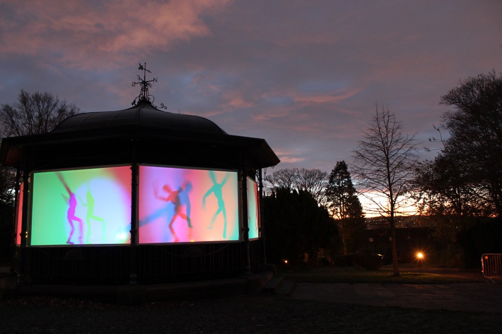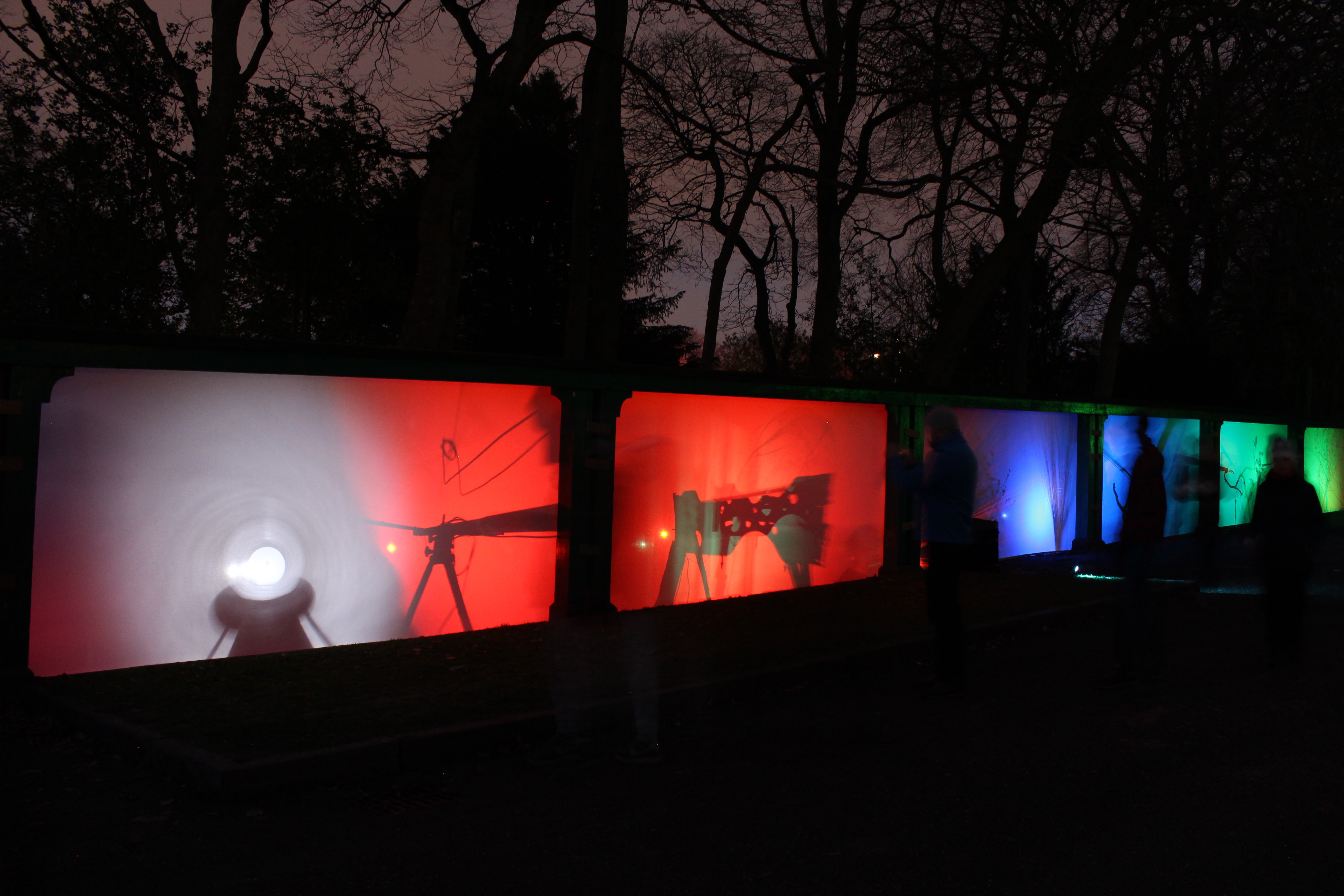Mechombre Fugue was a kinetic sound/ shadow projection installation. It consisted of nine large screens constructed within a shelter, with more eight screens around a Victorian bandstand. Nine tableaux reveal a journey in a fugue state, through a live compositions in sound and light